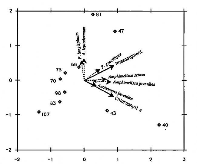 圖6. 放射蟲類群與光合色素分布關(guān)系的冗余分析雙序圖