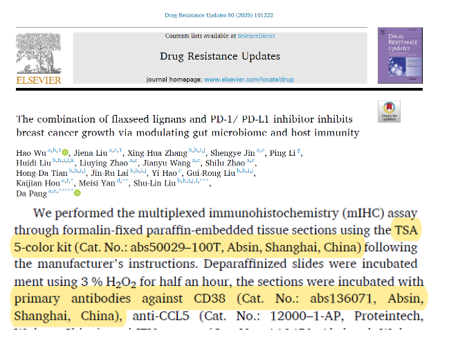 乳腺癌作為全球女性發(fā)病率最高的惡性腫瘤,免疫檢查點(diǎn)抑制劑(如 PD-1/PD-L1 抑制劑)雖為部分患者帶來(lái)希望,但僅少數(shù)患者能長(zhǎng)期受益,亟需探索增強(qiáng)免疫治療療效的新策略。近期《Drug Resistance Updates》(2025, 80: 101222)發(fā)表重磅研究,揭示亞麻籽木脂素(FL)通過(guò)調(diào)節(jié)腸道菌群與宿主免疫,顯著增強(qiáng) PD-1 抑制劑的抗乳腺癌效果,為臨床聯(lián)合治療提供全新思路。而 Absin 的 五色多重?zé)晒饷庖呓M化試劑盒(abs50029)與特異性抗體(abs136071),正是該研究精準(zhǔn)解析腫瘤免疫微環(huán)境、驗(yàn)證核心機(jī)制的關(guān)鍵工具。