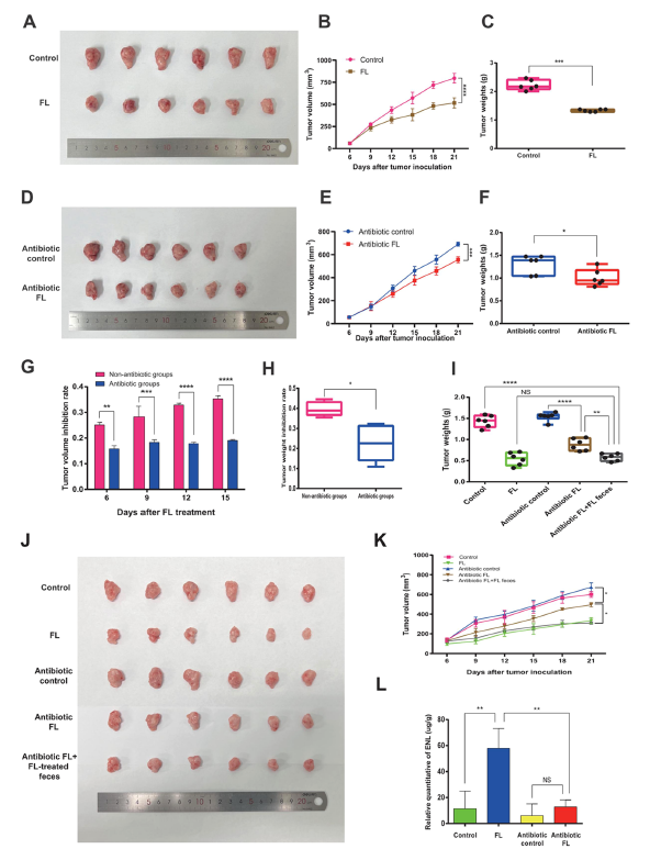 體內(nèi)驗(yàn)證:給乳腺癌小鼠口服 FL 后,腫瘤體積和重量顯著降低;若用抗生素破壞腸道菌群,F(xiàn)L 的抗瘤效果大幅減弱;而補(bǔ)充 ENL 或移植 FL 處理小鼠的糞便(FMT),可恢復(fù)抗瘤活性。