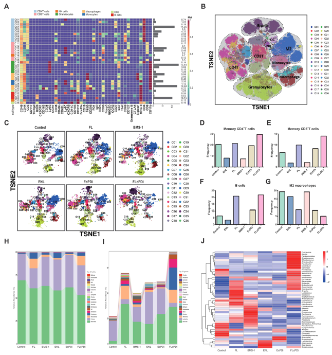 圖:FLcPDi處理后腫瘤免疫細(xì)胞組成(CyTOF分析)及腸道菌群豐度變化(原文圖7)