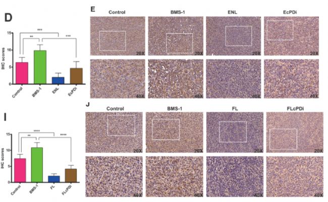 結(jié)果顯示:FL 或 FLcPDi 組腫瘤中 CD38 陽(yáng)性信號(hào)顯著弱于對(duì)照組,直接證明 FL 可通過(guò)下調(diào) CD38 增強(qiáng) PDi 療效,為 “FL/ENL/CD38 軸” 提供關(guān)鍵形態(tài)學(xué)證據(jù)。