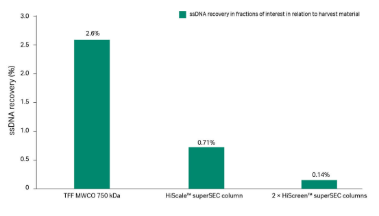 HiScale™層析柱運(yùn)行結(jié)果證實(shí),外泌體和蛋白質(zhì)污染物也能在更大規(guī)模下實(shí)現(xiàn)分離。切向流過濾(TFF)過程中的核酸酶處理是有效的,且能改善宿主DNA的去除效果——采用核酸酶處理的TFF步驟后,外泌體樣品中97%的DNA殘留被去除,而未使用核酸酶時(shí)僅能去除40%。superSEC樹脂純化步驟進(jìn)一步提高了外泌體組分中DNA的去除率,這證實(shí)superSEC可作為外泌體純化第二步的有效替代方法。納米顆粒追蹤分析(NTA)還顯示,在整個(gè)過程中,顆粒的平均尺寸(150至160納米)沒有變化。