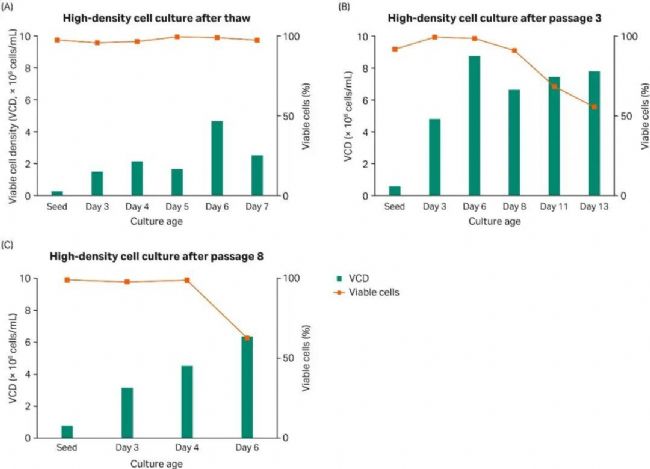 在搖瓶中的高密度培養(yǎng)可達(dá)到 9.0 × 106 個細(xì)胞,可進(jìn)行 rAAV 批量生產(chǎn)。