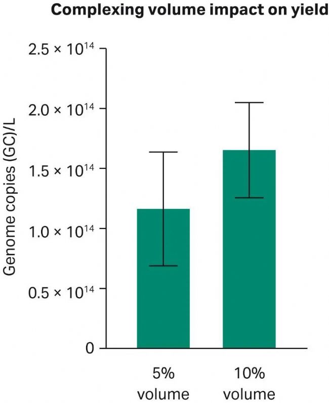 為研究該培養(yǎng)基對 PEI-DNA 復(fù)合物穩(wěn)定性的影響,測試了轉(zhuǎn)染復(fù)合物在HyClone Peak Expression 培養(yǎng)基中的占比(占rAAV生產(chǎn)總體積的5% 或10%)。每種條件按三次重復(fù)在搖瓶中進(jìn)行實(shí)驗(yàn)。結(jié)果顯示 占比為10% 時(shí),一致性較好,因此在使用 HyClone Peak Expression 培養(yǎng)基的rAAV 生產(chǎn)實(shí)驗(yàn)中,推薦使用該體積。
