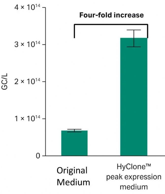 我們評估了 rAAV5 在兩種不同培養(yǎng)基(HyClone Peak Expression 培養(yǎng)基和原培養(yǎng)基)中的產(chǎn)率。滴度測定結(jié)果以 GC/L(基因組拷貝數(shù)/升)為單位,對四次重復(fù)實(shí)驗(yàn)進(jìn)行比較。