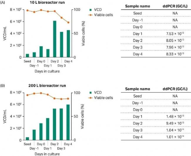 最后,我們將 rAAV5-GFP 的生產(chǎn)進(jìn)行了放大,由搖瓶培養(yǎng)改為用 10 L 規(guī)格的 Xcellerex XDR-10 生物反應(yīng)器培養(yǎng),然后用 200 L 規(guī)格的 XDR-200 生物反應(yīng)器進(jìn)一步放大培養(yǎng)。結(jié)果顯示,雖然相較與搖瓶培養(yǎng)的產(chǎn)率稍有下降,但總體來說該工藝可在 10 L 至 200 L 生物反應(yīng)器之間進(jìn)行放大。GFP 的百分比峰值出現(xiàn)在轉(zhuǎn)染后第 48 小時(shí)(未顯示相關(guān)數(shù)據(jù))。