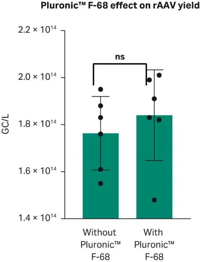 為避免聚集,對抗剪切損傷,并促進(jìn)懸浮培養(yǎng)的細(xì)胞生長,通常在生長培養(yǎng)基中使用泊洛沙姆。盡管收率沒有顯著的統(tǒng)計(jì)學(xué)差異,我們?nèi)匀话l(fā)現(xiàn),在 PEI 和 DNA 復(fù)合物中未添加 Pluronic F-68 的情況下,rAAV 產(chǎn)率低于 1.8 × 1014 GC/L,反之,rAAV 產(chǎn)率高于 1.8 × 1014 GC/L。