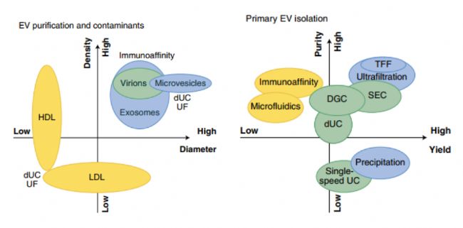 對于治療性外泌體,終產(chǎn)物的純度對于臨床應(yīng)用與監(jiān)管至關(guān)重要。以外泌體為基礎(chǔ)的藥物成分的生產(chǎn)中需要去除的雜質(zhì)主要是細胞碎片、蛋白質(zhì)、宿主細胞DNA以及非外泌體的細胞外囊泡,比如凋亡小體和微囊泡。而外泌體的大小和理化性質(zhì)與脂蛋白、蛋白質(zhì)復(fù)合體和乳糜微粒等均有不同程度的重疊,這也為外泌體的分離與富集帶來了挑戰(zhàn)。