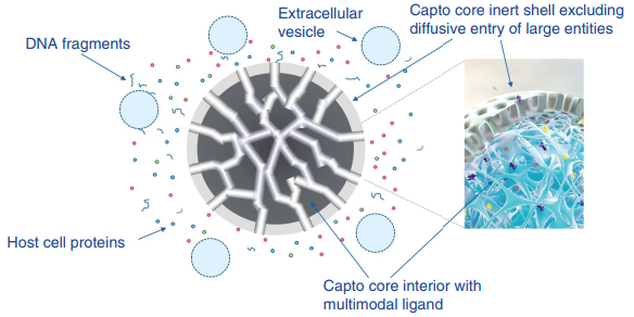 基于這一現(xiàn)狀,多模式層析填料Cytiva Capto core 700成為外泌體領(lǐng)域備受喜愛的新寵。Capto core 700由配基活化核心和5 μm惰性外殼組成,惰性外殼不允許超過700kDa的大分子進入核內(nèi),而外泌體樣品中的小分子,比如宿主細胞蛋白、DNA片段等,進入核內(nèi)后,與兼具陰離子交換和疏水作用的辛胺基團結(jié)合,從而達到分離目的。這一多模式填料通過流穿模式分離外泌體樣品,上樣量更高,而且新一代的Capto基架滿足高流速的要求,高效捕獲污染物的同時節(jié)省操作時間。