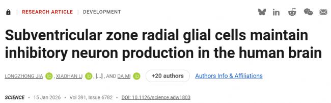 2026年1月15日,清華大學米達教授團隊聯(lián)合中國醫(yī)學科學院北京協(xié)和醫(yī)院朱蘭院士團隊在Science期刊上發(fā)表了題名為“Subventricular zone radial glial cells maintain inhibitory neuron production in the human brain”的研究論文,揭示了人類大腦抑制性神經(jīng)元生成的新機制。