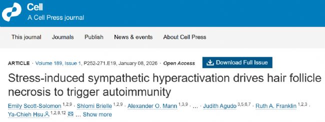 2026年1月8日,美國學者在Cell期刊上發(fā)表了題名為“Stress-induced sympathetic hyperactivation drives hair follicle necrosis to trigger autoimmunity”的研究論文,研究揭示了急性應(yīng)激通過交感神經(jīng)通路誘發(fā)毛囊壞死并激活自身免疫的機制。