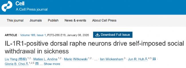 2026年1月8日,美國聯(lián)合日本的學者在Cell期刊上發(fā)表了題名為“IL-1R1-positive dorsal raphe neurons drive self-imposed social withdrawal in sickness”的研究論文,闡明了炎癥狀態(tài)下動物主動社會回避行為的神經(jīng)機制。