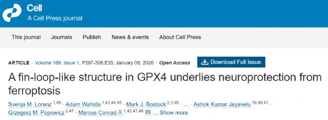 2026年1月8日,德國、日本、比利時、美國以及澳大利亞的學者聯(lián)合在Cell期刊上發(fā)表了題名為“A fin-loop-like structure in GPX4 underlies neuroprotection from ferroptosis”的研究論文,揭示了GPX4蛋白結(jié)構(gòu)在抗鐵死亡神經(jīng)保護中的關(guān)鍵作用。