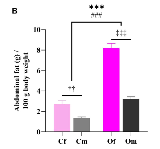 在MSG誘導(dǎo)的雌性和雄性大鼠中,均觀察到腹部脂肪組織顯著增加,雌性脂肪堆積更顯著。MSG誘導(dǎo)的肥胖對(duì)雄性和雌性大鼠的學(xué)習(xí)和記憶的有害影響相似。有趣的是,兩性均未表現(xiàn)出與肥胖相關(guān)的焦慮樣行為改變或海馬體中的氧化應(yīng)激水平改變。然而,在肥胖的雌性大鼠中存在顯著差異,她們的血細(xì)胞中顯示出DNA損傷的跡象,而雄性大鼠中未觀察到這種現(xiàn)象。