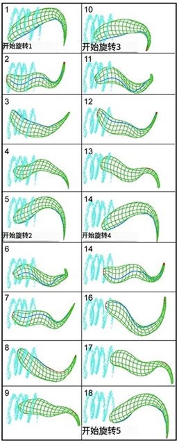 如圖所示。利用多粒子碰撞動(dòng)力學(xué)模擬錐蟲模型的運(yùn)動(dòng),證實(shí)了實(shí)驗(yàn)觀察到的錐蟲運(yùn)動(dòng)模式。面板1-18示出了示例性仿真的選定幀。圖片說明了四個(gè)完整的細(xì)胞旋轉(zhuǎn)。細(xì)胞后極的路徑以青色示出。由于細(xì)胞體的旋轉(zhuǎn),模擬的鞭毛(藍(lán)色)總是在細(xì)胞的相對(duì)兩側(cè)出現(xiàn)和消失。