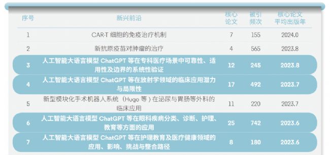 2025 年度遴選出 7 個(gè)新興前沿方向,主要聚焦四大領(lǐng)域:CAR-T 細(xì)胞免疫治療的作用機(jī)制研究、新抗原疫苗在腫瘤治療中的應(yīng)用探索、Hugo 等新型模塊化手術(shù)機(jī)器人系統(tǒng)于泌尿、胃腸等外科的臨床應(yīng)用,以及 ChatGPT 等人工智能大語(yǔ)言模型在醫(yī)療健康領(lǐng)域的應(yīng)用拓展。