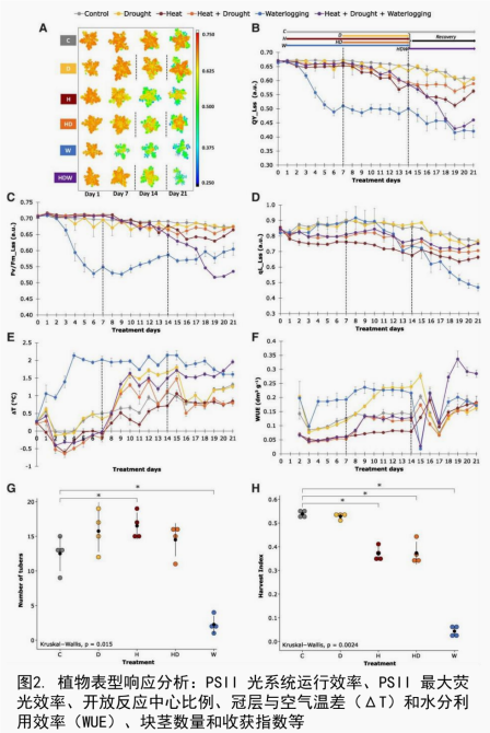 在這項(xiàng)覆蓋5種脅迫處理(高溫、干旱、水澇、高溫+干旱、高溫+干旱+水澇)的研究中,PlantScreen平臺承擔(dān)了“全天候表型監(jiān)測官”的角色。研究團(tuán)隊(duì)選取中度抗逆的馬鈴薯Desirée品種,通過平臺集成的RGB成像、葉綠素?zé)晒獬上、熱成像等多傳感器模塊,實(shí)現(xiàn)了每日無侵入式數(shù)據(jù)采集。