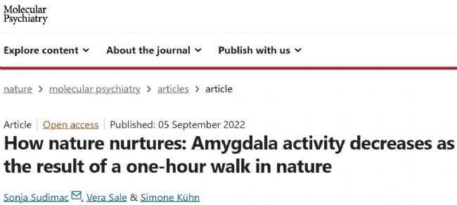 Sudimac, S., Sale, V. & Kühn, S. How nature nurtures: Amygdala activity decreases as the result of a one-hour walk in nature. Mol Psychiatry 27, 4446–4452 (2022).