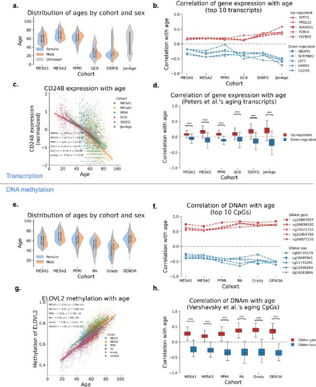 相比之下,對六個DNAm數(shù)據(jù)集(MESA1、MESA2、PPMI、RA、Grady、GENOA)分析顯示,TOP10的衰老相關(guān)CpG位點(如ELOVL2啟動子區(qū)的cg16867657)在所有隊列中均表現(xiàn)出高度一致衰老相關(guān)性(Pearson相關(guān)系數(shù):MESA1 r=0.74,RA r=0.84,GENOA r=0.84)(圖1g-h)。這種不同隊列數(shù)據(jù)高度一致性表明,DNAm變化是血液中更為優(yōu)越穩(wěn)定和可重復的衰老標志物,但需要與功能性的轉(zhuǎn)錄組數(shù)據(jù)整合以揭示其生物學意義。
