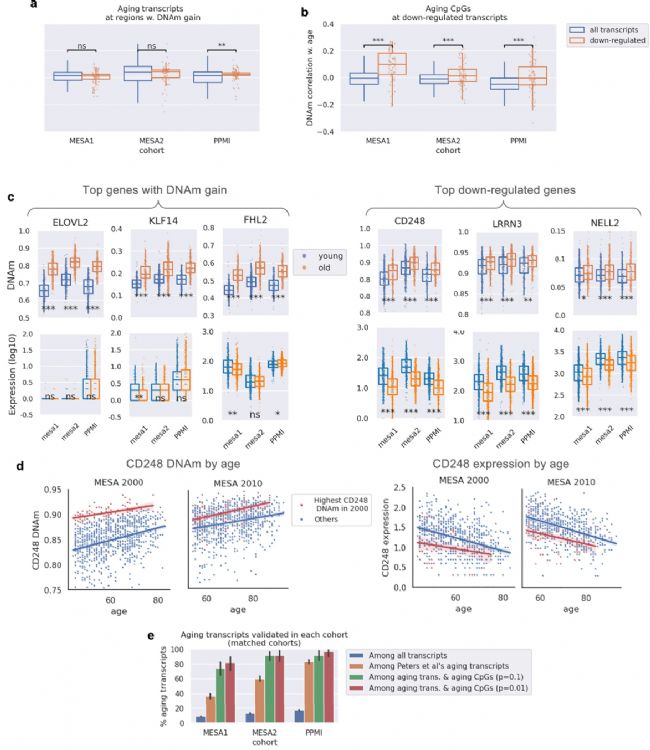 具體而言,ELOVL2、KLF14和FHL2等衰老顯著相關(guān)CpG位點的基因,在年輕(≤45歲)與年老(≥75歲)個體間的表達水平無顯著差異(圖2c左);而CD248、LRRN3和NELL2等最顯著下調(diào)轉(zhuǎn)錄本則在老年個體中表現(xiàn)出顯著啟動子區(qū)高甲基化(圖2c右)。特別值得注意的是,CD248在MESA兩個時間點及PPMI中均表現(xiàn)出DNAm與衰老的強正相關(guān)和表達與衰老的強負相關(guān)(圖2d)。這一模式在MESA兩個時間點和PPMI數(shù)據(jù)集中均成立。
