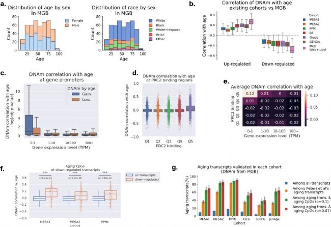 為對鑒定的多組學衰老基因進行獨立驗證,研究利用935k甲基化芯片對Mass General Brigham隊列的500名個體(MGB500,質(zhì)控后n=461)進行DNAm檢測。該隊列年齡跨度20-90歲,性別和種族分布均衡,可作為血液衰老生物標志物的金標準參考數(shù)據(jù)集(圖3a)。