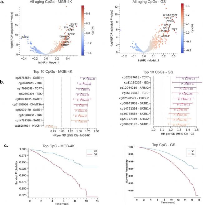 為評估所鑒定多組學衰老基因的功能相關(guān)性,研究分析了其與衰老相關(guān)結(jié)局(特別是死亡率)的關(guān)聯(lián)。利用包含DNA甲基化和死亡率數(shù)據(jù)的大型數(shù)據(jù)集(MGB-4K和Generation Scotland隊列),發(fā)現(xiàn)與多組學衰老基因相關(guān)的CpG位點,在兩個隊列中都與全因死亡風險強相關(guān)(圖4a)。通過多變量Cox比例風險回歸模型(校正年齡和性別),發(fā)現(xiàn)這些基因的CpG位點與死亡風險顯著相關(guān)(圖4b)。