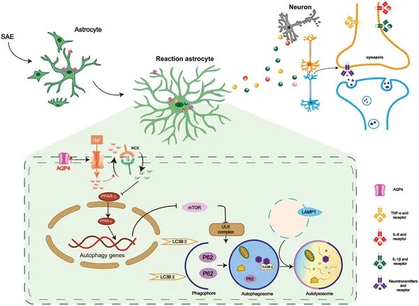 在機(jī)制層面,AQP4敲除能夠逆轉(zhuǎn)CLP或LPS引起的星形膠質(zhì)細(xì)胞內(nèi)PPAR-γ信號(hào)抑制,該過(guò)程與細(xì)胞內(nèi)鈣離子水平及鈉通道活性相關(guān)。研究表明,AQP4通過(guò)下調(diào)星形膠質(zhì)細(xì)胞Nav1.6通道,減少胞內(nèi)鈣離子累積,進(jìn)而抑制PPAR-γ通路,最終阻礙自噬激活并加劇神經(jīng)炎癥。在SAE小鼠模型中,激活自噬、抑制炎癥或特異性下調(diào)星形膠質(zhì)細(xì)胞Nav1.6表達(dá),均可顯著改善AQP4缺失所導(dǎo)致的認(rèn)知功能損害。