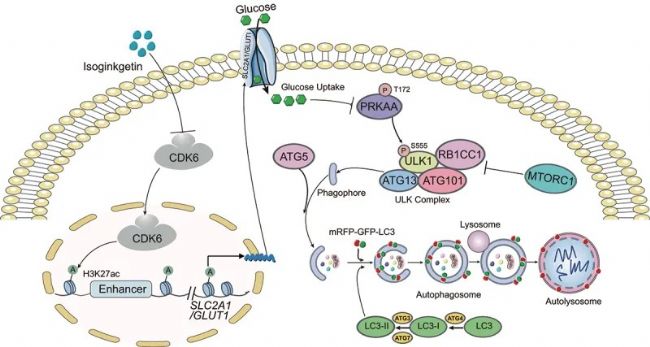 異銀杏素(ISO)在多種癌細(xì)胞中表現(xiàn)出細(xì)胞毒性,但其在肝細(xì)胞癌(HCC)中的作用機(jī)制尚不明確。本研究發(fā)表于《自噬》(IF:13.3),系統(tǒng)揭示了ISO通過(guò)靶向CDK6抑制葡萄糖轉(zhuǎn)運(yùn)、激活自噬通路從而抑制HCC的分子機(jī)制。