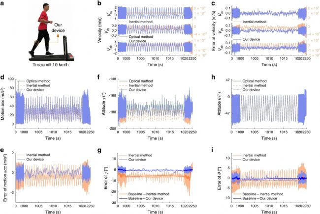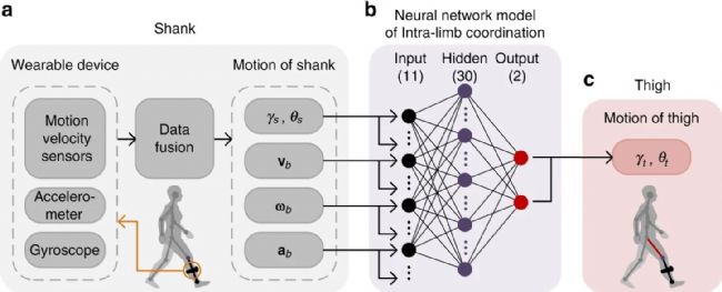 另外,團(tuán)隊(duì)還根據(jù)人體行走和跑步時(shí)小腿與大腿之間的肢體內(nèi)部協(xié)調(diào)關(guān)系,并建立了表征下肢肢體內(nèi)部協(xié)調(diào)關(guān)系的神經(jīng)網(wǎng)絡(luò)模型 —— 利用該模型,可通過人體行走和跑步時(shí)的小腿運(yùn)動(dòng)確定大腿運(yùn)動(dòng)(圖2b)。因此,用戶僅需在小腿佩戴單個(gè)設(shè)備,即可實(shí)時(shí)檢測(cè)小腿和大腿的運(yùn)動(dòng)。
