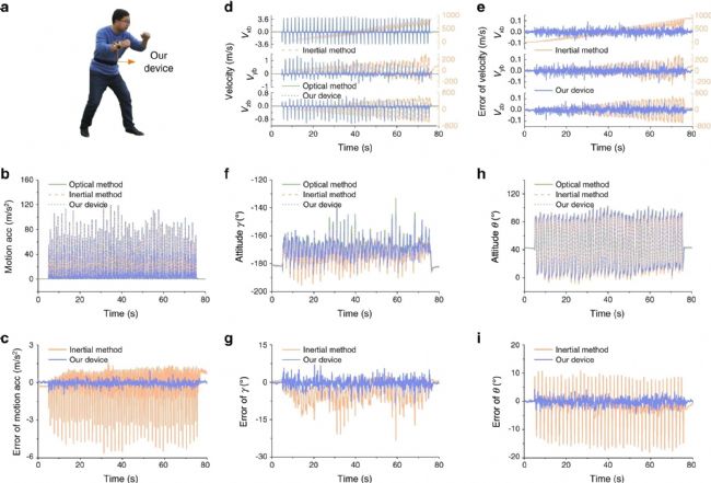 針對(duì)這一長(zhǎng)期存在的技術(shù)難題,清華大學(xué)朱榮教授團(tuán)隊(duì)在發(fā)表于《Nature Communications》的論文“A wearable motion capture device able to detect dynamic motion of human limbs”中提出了一種不同于傳統(tǒng)慣性方法的解決思路。與依賴加速度積分來估計(jì)速度不同,該研究的核心思想是:直接測(cè)量肢體運(yùn)動(dòng)速度,而非事后通過積分計(jì)算得到。研究團(tuán)隊(duì)受到魚類和兩棲動(dòng)物的側(cè)線系統(tǒng)的啟發(fā),設(shè)計(jì)了一種微型流速傳感器,用于感知人體肢體在運(yùn)動(dòng)過程中相對(duì)于空氣產(chǎn)生的局部氣流變化。通過將這種微流速傳感器與傳統(tǒng)的加速度計(jì)和陀螺儀集成在同一可穿戴設(shè)備中,系統(tǒng)能夠在不進(jìn)行長(zhǎng)期積分的情況下,同時(shí)獲取肢體的運(yùn)動(dòng)速度、角速度和姿態(tài)信息。通過一系列高動(dòng)態(tài)實(shí)驗(yàn),系統(tǒng)性地驗(yàn)證了該方法在速度估計(jì)精度、姿態(tài)穩(wěn)定性以及長(zhǎng)期監(jiān)測(cè)能力方面的優(yōu)勢(shì)。