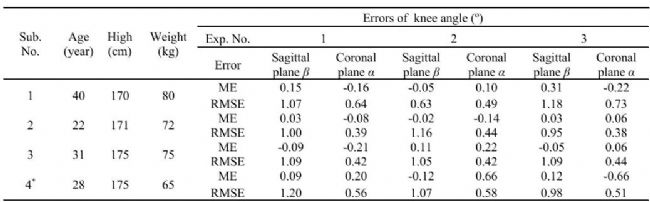 表1. 小腿佩戴單設(shè)備的下肢運(yùn)動(dòng)捕捉中膝關(guān)節(jié)角度的測(cè)量誤差
