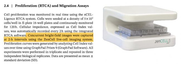 在細胞增殖實時監(jiān)測實驗中,作者采用了xCELLigence RTCA系統(tǒng)與InnoME公司的zenCell owl活細胞動態(tài)成像及分析系統(tǒng)聯(lián)合使用的方式,評估 EP 對細胞增殖的抑制作用。