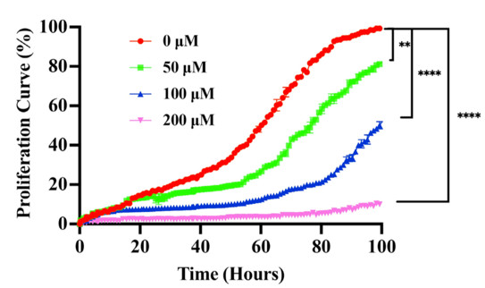 作者選用 DU145細胞,同時以RWPE-1 作為對照。將細胞以5×10³ 個 / 孔的密度接種到 E-plate 16 孔板中,分別加入 50 μM、100 μM、200 μM 濃度的 EP 及 DMSO(對照組)處理,持續(xù)監(jiān)測 120 小時。使用 RTCA 軟件每2 小時記錄一次細胞指數(shù)。同時使用 zenCell owl每 2 小時捕捉一次明場圖像,使用GraphPad Prism 9(GraphPad軟件)分析細胞指數(shù)值隨時間的變化來生成增殖曲線 。