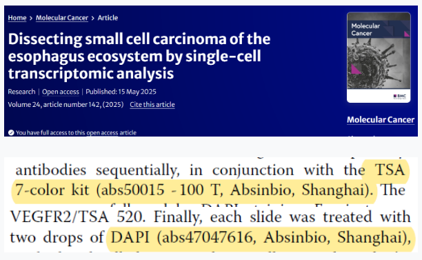 中山大學(xué)腫瘤防治中心的這項研究,不僅為 SCCE 的基礎(chǔ)研究和臨床治療提供了重要依據(jù),也彰顯了多色免疫組化技術(shù)在驗(yàn)證單細(xì)胞測序發(fā)現(xiàn)中的核心價值。Absin 作為科研工具解決方案提供商,始終以高質(zhì)量產(chǎn)品助力科研創(chuàng)新: