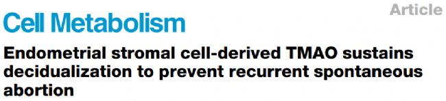 2026年1月8日,上海交通大學趙健元、李博、復旦大學金莉萍,上海國際和平婦幼保健院李明清共同通訊在Cell Metabolism(IF=30.9)在線發(fā)表題為Endometrial stromal cell-derived TMAO sustains decidualization to prevent recurrent spontaneous abortion的研究論文。