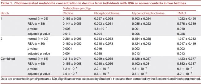 研究者采集了38例RSA患者和38名因非醫(yī)學原因終止妊娠的臨床正常妊娠個體樣本,通過核磁共振的非靶向代謝組分析,觀察兩者的代謝差異。結(jié)果表明,在RSA病例的胎盤基底膜中,膽堿相關(guān)代謝產(chǎn)物,包括膽堿、磷酰膽堿、甘油磷膽和TMAO顯著低于對照組,而在絨毛組織與血漿樣本中進行了相關(guān)分析非發(fā)現(xiàn)明顯差異。這表明與復發(fā)性流產(chǎn)相關(guān)的并非飲食誘導的代謝差異,而是胎盤基底膜中局部產(chǎn)生的膽堿相關(guān)代謝物豐度降低。