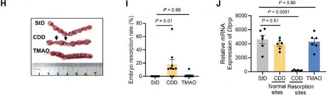 此外,標準飼料喂養(yǎng)小鼠的子宮TMAO濃度隨妊娠天數(shù)增加而升高,并在妊娠第10.5天達到峰值,與實驗組出現(xiàn)表型時間吻合。隨后研究者采用膽堿缺乏飼料喂養(yǎng)以限制TMAO生成。小鼠隨機分配至標準飲食組(StD)、膽堿缺乏飲食組(CDD)或補充0.5% TMAO的CDD組。在妊娠第10.5天時,與StD組相比,CDD組胚胎吸收率升高,補充TMAO后該現(xiàn)象得到逆轉(zhuǎn),且CDD組Dtprp表達顯著降低(圖H-J)。