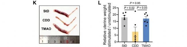 為探究TMAO在蛻膜化過程中的作用,通過在三種不同飲食中添加芝麻油誘導假性蛻膜化反應。CDD組小鼠對刺激反應減弱,導致其滋養(yǎng)層瘤體積小于對照組。但補充TMAO可有效挽救該表型(圖K和L)。