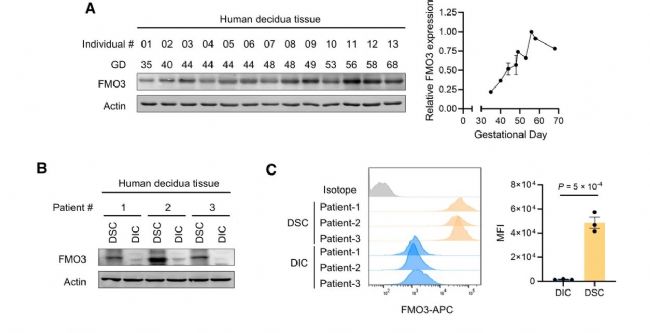 接下來,研究者檢測人類妊娠早期FMO3的表達水平,結(jié)果顯示,FMO3蛋白表達隨妊娠進展呈漸進性上升,且FMO3主要表達于滋養(yǎng)層干細胞(DSCs)而非滋養(yǎng)層免疫細胞(DICs)(圖A-C)。