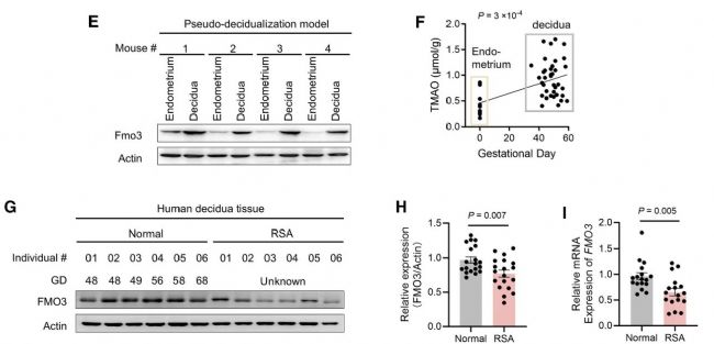 與小鼠模型相似,人類妊娠婦女的子宮內(nèi)膜樣本顯示出顯著高于非妊娠個體的TMAO水平,且隨妊娠進展呈漸進性積累(圖E-F)。并且復發(fā)性流產(chǎn)患者樣本中FMO3的蛋白和mRNA(圖G-I)水平均顯著降低。