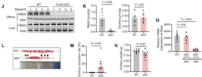 研究者構(gòu)建了子宮特異性Fmo3特異性敲除(cKO)與特異性敲低小鼠。特異性敲除小鼠使用了Fmo3f/f; Pgrcre/+小鼠;特異性敲低小鼠使用在宮腔內(nèi)注射AAV9-CMV-shFmo3。兩種模型均表現(xiàn)出子宮TMAO水平顯著降低,妊娠過程中顯著增加胚胎吸收率、降低胚胎重量、吸收部位胎盤膜標志物下調(diào)等表型,表明胎盤膜化過程受損(圖J-O)。