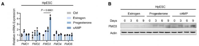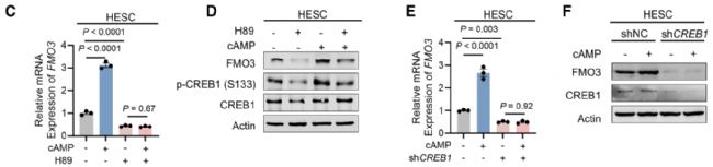 研究者進一步探究雌激素、8-溴環(huán)磷酸腺苷(cAMP)和醋酸甲羥孕酮(MPA)中哪一種激素主要調(diào)控FMO3的表達。在HpESCs體外模型中,cAMP顯著誘導FMO3表達,而FMO1、FMO2、FMO4和FMO5的表達水平保持不變(圖A和B)。