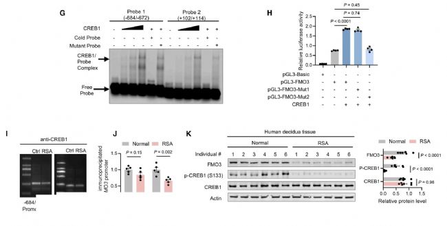 CREB1可結(jié)合FMO3啟動子中−684至−672及+102至+114位點,而其中+102/+114位點影響CREB1的轉(zhuǎn)錄活性(圖G-I)。此外,在復發(fā)性流產(chǎn)患者的胎盤組織中,經(jīng)CREB1免疫沉淀的FMO3 +102/+114區(qū)域表達水平低于對照組,CREB1磷酸化水平降低(圖J-K)。