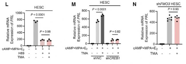 研究者通過使用H89抑制PKA或通過shRNA敲低CREB1或敲低FMO3均觀察到TMA誘導的蛻膜化促進作用減弱(圖L-N),這些綜合結(jié)果有力證明:cAMP-CREB1信號通路在激活FMO3表達中發(fā)揮關(guān)鍵作用,而FMO3表達又正向調(diào)控胎盤形成過程。