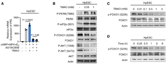 在HpESCs體外模型中,F(xiàn)OXO1抑制劑AS1842856阻斷了TMAO對蛻膜化作用的影響。而使用TMAO處理可抑制HpESCs中AKT的磷酸化,且TMAO在不同劑量(0.01-5 mM)和時間點(最長6小時)范圍內(nèi)均可影響FOXO1磷酸化水平,而未改變FOXO1的表達水平(圖B-D)。這些發(fā)現(xiàn)表明,盡管TMAO可通過PERK依賴性積累和AKT依賴性去磷酸化雙重途徑調(diào)節(jié)FOXO1,但在胎盤基底膜中觀察到的生理濃度下,AKT介導的機制可能占主導地位。