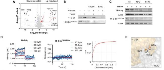 為探究14-3-3η與TMAO的潛在相互作用位點,研究者進行分子對接模擬,并用突變體證實D214和D218是介導TMAO與14-3-3η特異性相互作用的關(guān)鍵殘基(圖B-E)。綜合上述功能分析表明,TMAO可直接與14-3-3η結(jié)合。
