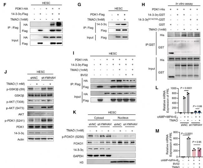 結(jié)構(gòu)預測進一步揭示,TMAO結(jié)合位點位于14-3-3η與PDK1相互作用的界面(圖E)。IP與GST沉淀實驗證實,TMAO處理顯著增強了14-3-3η-PDK1相互作用,且依賴于D214、D218位點(圖F-H)。14-3-3η抑制劑BV02阻斷了TMAO介導的結(jié)合增強作用(圖I)。此外,TMAO抑制了PDK1-AKT通路和FOXO1核轉(zhuǎn)位,而敲低14-3-3η可消除這種抑制作用(圖J-K)。并且無論是敲低14-3-3η或是使用抑制劑BV02均會損害體外蛻膜化過程并激活AKT-FOXO1通路,導致該系統(tǒng)對TMAO的挽救作用無反應(圖L-M)。