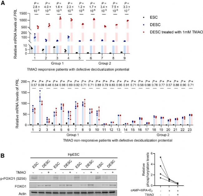 膽堿相關(guān)代謝產(chǎn)物中,研究者發(fā)現(xiàn)僅TMA和TMAO顯著上調(diào)IGFBP1和PRL的表達,且TMAO和TMA均能促進HpESCs體外蛻膜化進程(圖B-C)。