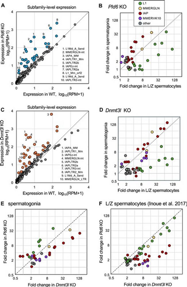 相比之下,Dnmt3lKO精原細(xì)胞(圖1C)表現(xiàn)出不同的激活模式:IAP和MMERGLN家族表現(xiàn)出更劇烈的轉(zhuǎn)錄激活(60-140倍),且與精母細(xì)胞中的激活程度相當(dāng);然而,L1亞家族的激活程度顯著較低(僅4-14倍),遠(yuǎn)低于其在Dnmt3lKO精母細(xì)胞中的激活水平(39-127倍)。