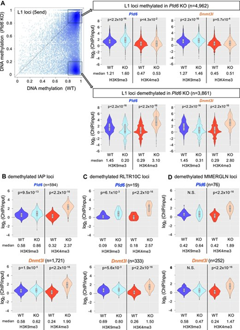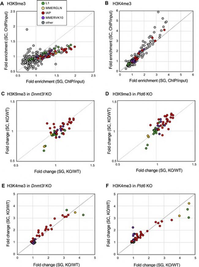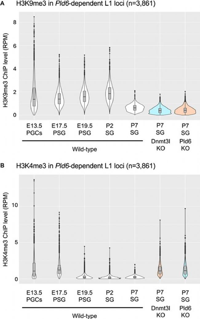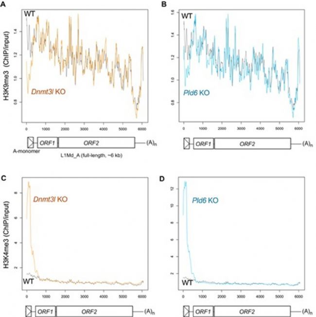 圖6:發(fā)育過(guò)程中Pld6依賴(lài)性L1拷貝的組蛋白甲基化修飾。
